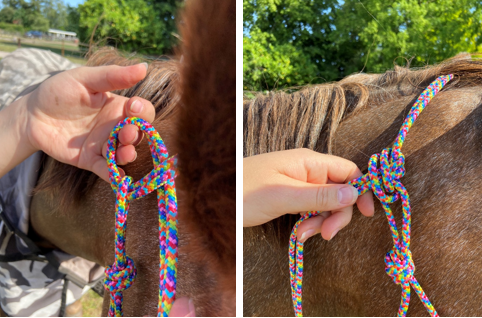 Tijd om het touwhalster te passen op je pony! De uiteindes van het touw kunnen nog een beetje lang zijn, maar die knippen we er later vanaf. Doe het touwhalster om de neus van je pony en haal de uiteindes van het touw over de nek. Nu kun je de uiteindes door de lus halen en hier een knoop in leggen. Dit is de sluiting van je halster en dit maak je elke keer vast en los als je het touwhalster bij je pony om en af doet. Als de uiteindes nog heel lang zijn, dan kun je een stukje tape om het touw doen waar het ongeveer afgeknipt moet worden. Doe nu het halster weer af voor de laatste stap.
